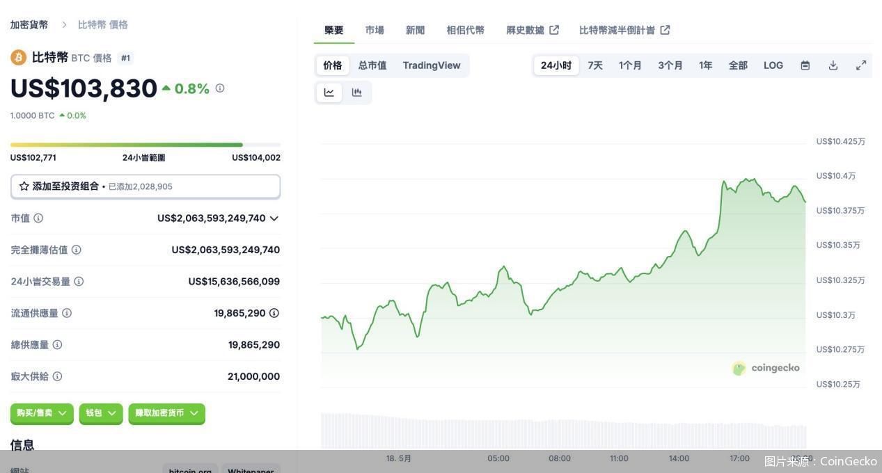 北京商报讯(记者廖蒙)风险事件频发,加密货币市场愈发震荡。5月18日,比特币在跌至103000美元下方后小幅回升,截至当日20时11分,比特币报103830美元,24小时涨幅为0.8%。以太坊报2501.83美元,24小时涨幅为0.7%。